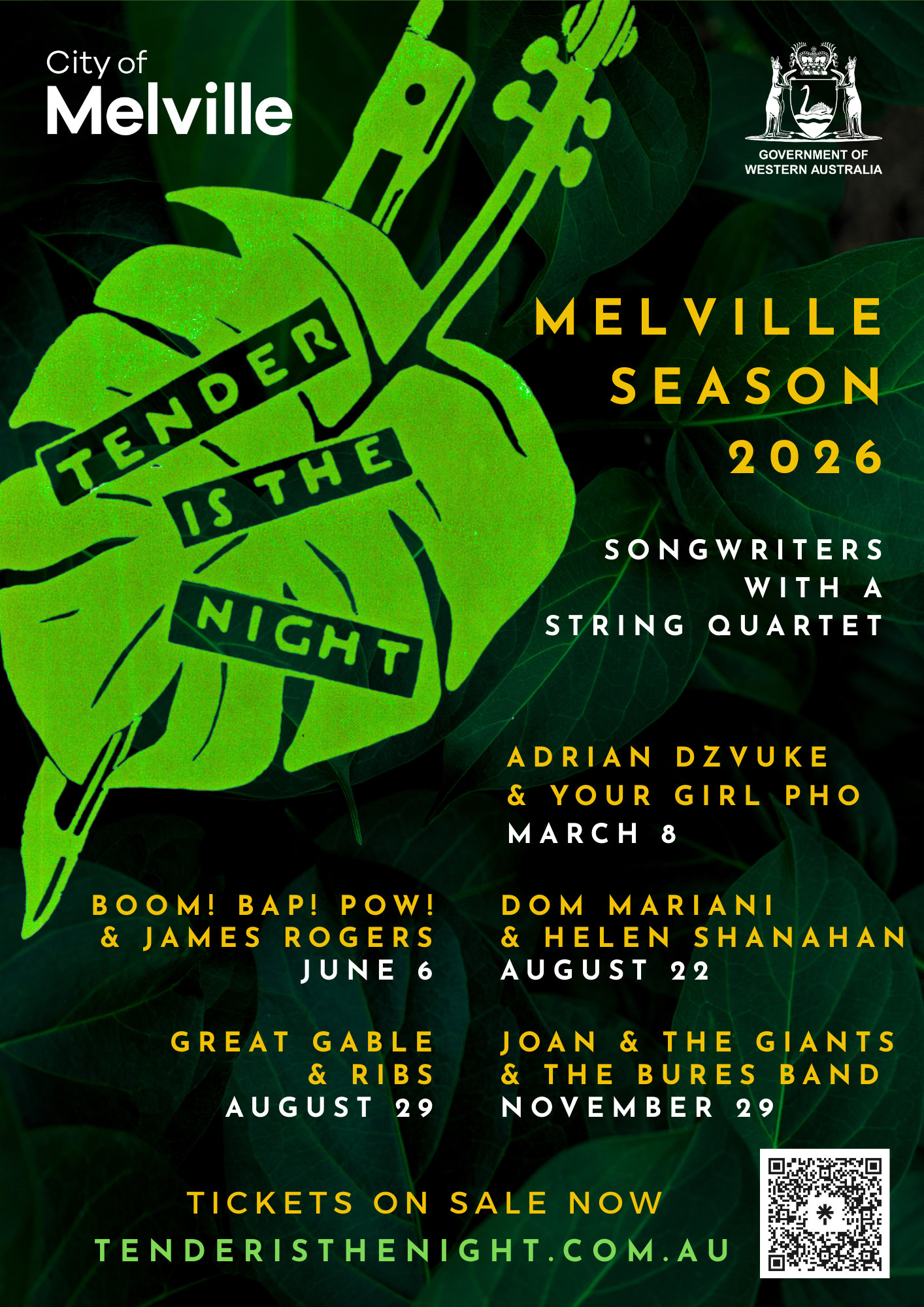 This talented line-up is backed by the superb sounds of the Tender Strings Quartet, with arrangements by emerging West Australian composers including Aaron Wyatt, Laurissa Brooke, and Simon Kruit.